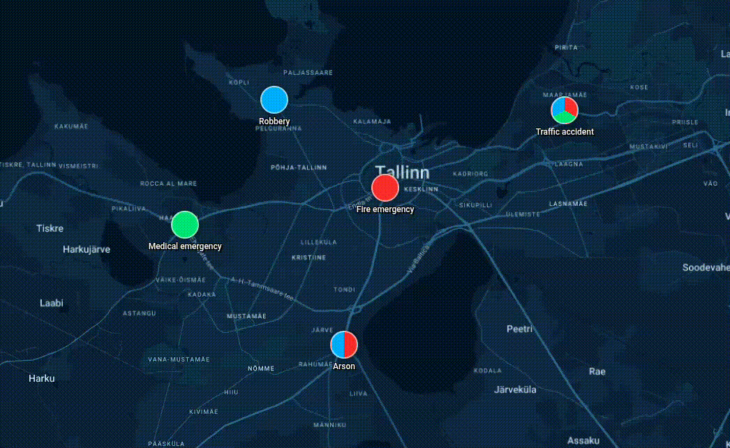 When an incident requires multiple services, the marker is split into segments — so a single glance tells you whether it's a fire, a medical call, a police matter, or something requiring all three. It's the same visual language used in real operations centers, made even more readable.